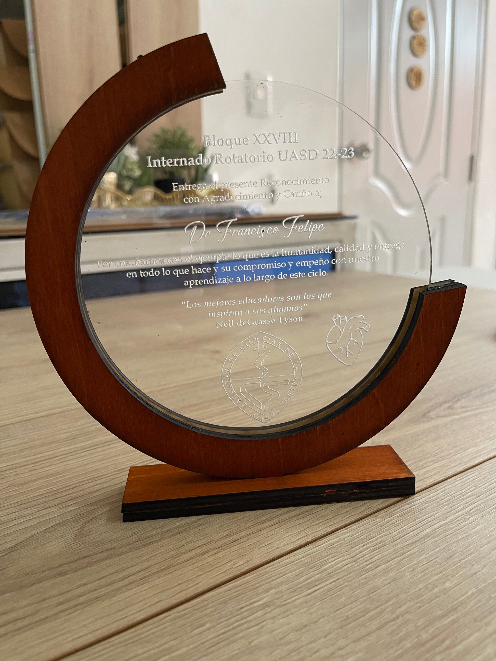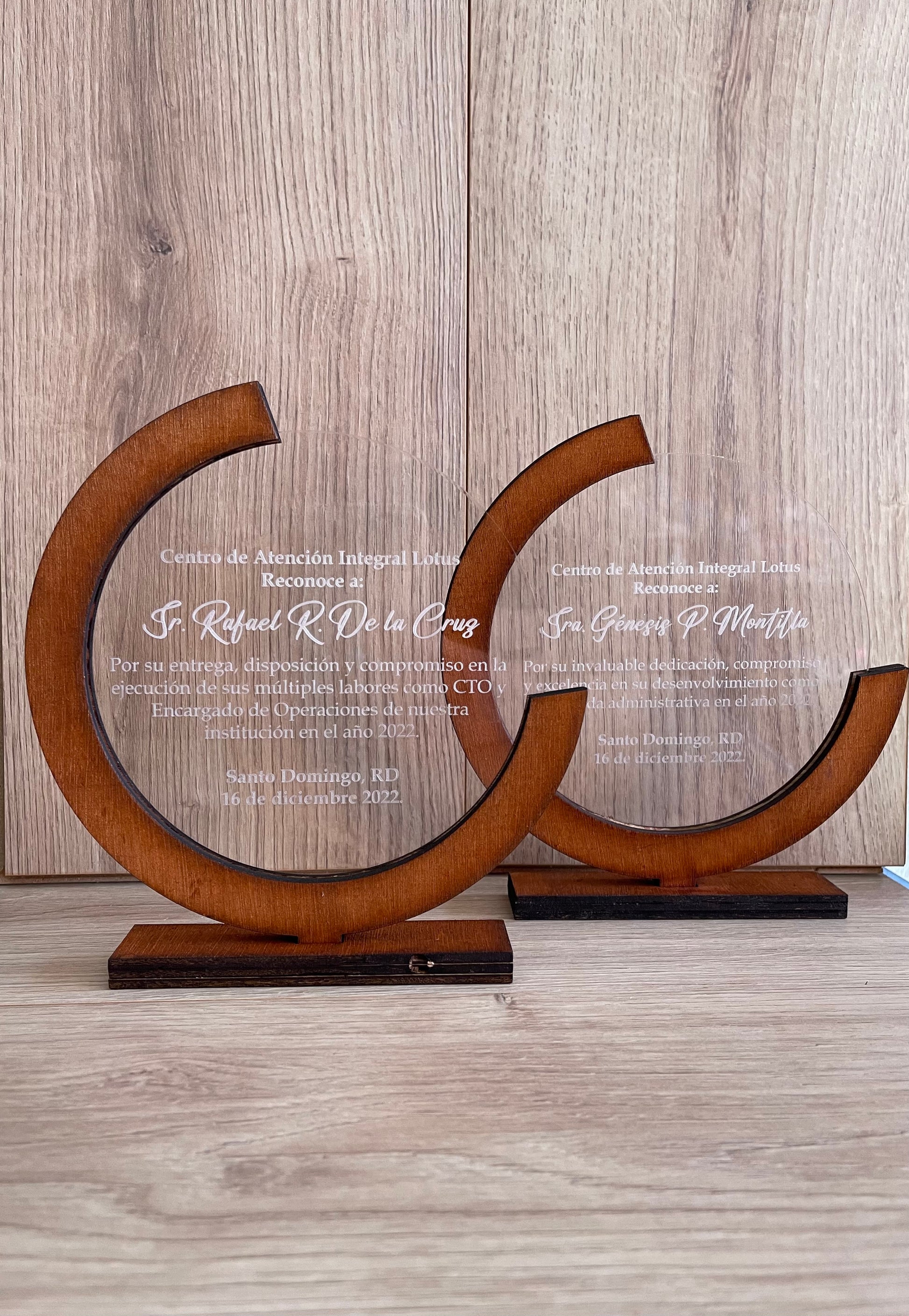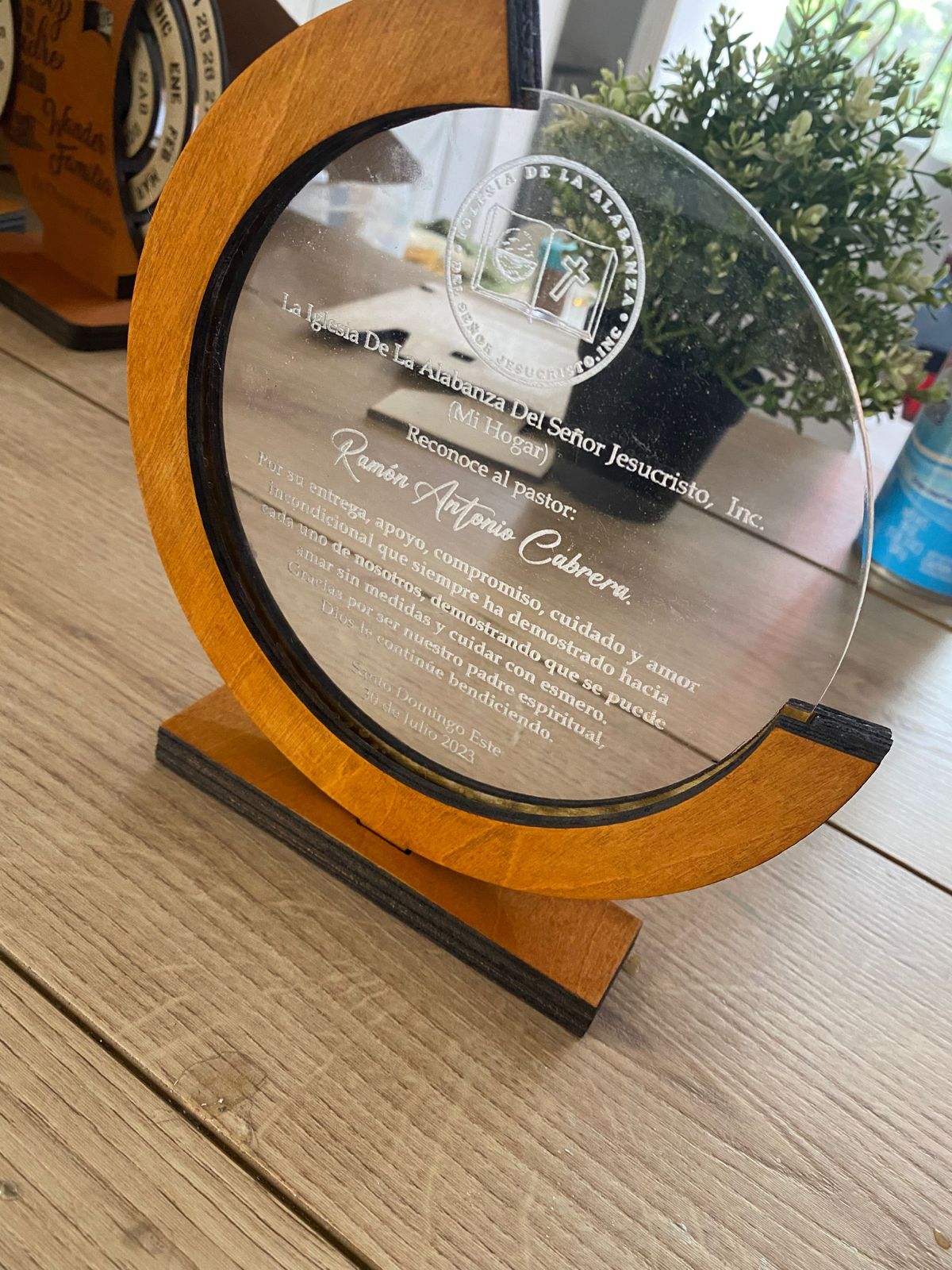 Reconocimiento en acrílico transparente y madera en tamaño de 12”x5”.