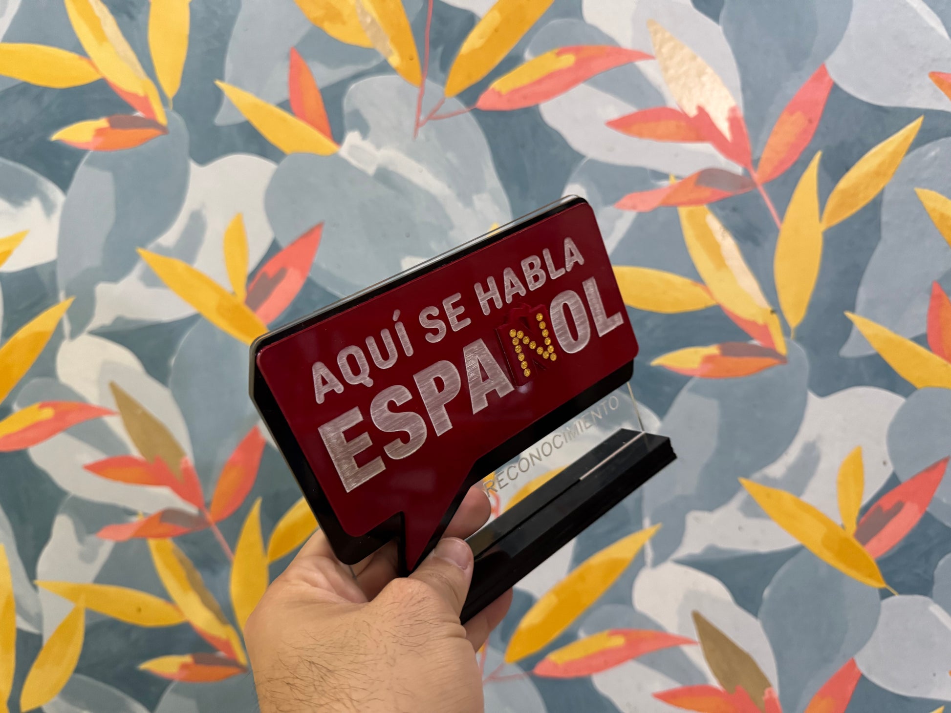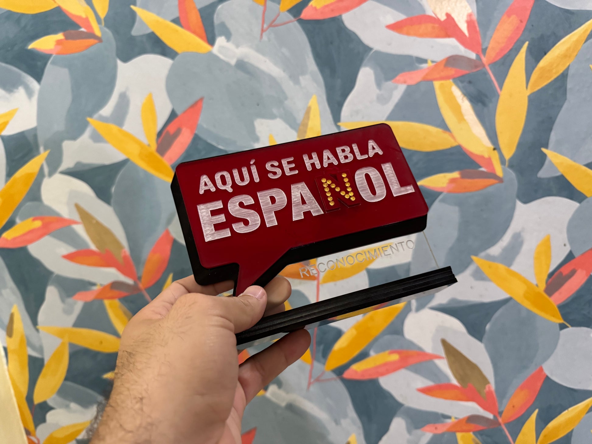 Reconocimiento en acrílico transparente y madera en tamaño de 12”x5”.